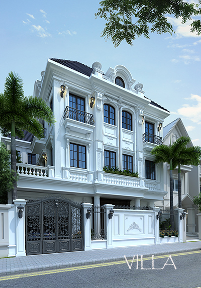 Thiết kế ngoại thất căn biệt thự theo phong cách tân cổ điển gợi cảm giác trang trọng và cổ điển thể hiện rõ nét cá tính và cái Tôi của gia chủ. Tone màu trắng và xanh được gia chủ ưu ái lựa chọn làm tone màu chủ đạo, đây cũng là hai tone màu phổ biến, được sử dụng trong hầu hết các thiết kế nội, ngoại thất những năm gần đây. Với thiết kế kết hợp hai tone màu nhẹ, không quá nổi bật mà làm điểm nhấn đặc biệt làm hài hòa hơn nữa đường nét nét kế và trang trí của căn biệt thự. Ngoài ra, không gian thiết kế xanh cũng là một trong những yếu tố phụ mang lại sắc xanh tự nhiên tạo sự cân bằng cho không gian sống.
